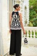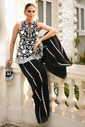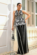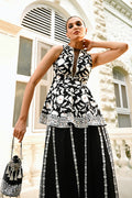 In sheer ebony khaddi corduroy layered over crepe, this sculpted peplum is embroidered with ivory florals and edged with diamante accents. A deep slit neckline with a tulle insert lends a touch of modern sensuality. Flowing palazzo trousers in georgette, defined by vertical embroidered panels, create a statuesque grace. The ensemble allows its crisp tailoring and bold geometry to speak with quiet confidence. A coordinating embroidered pouch, finished with pearl tassel accents, completes the look with vintage charm.