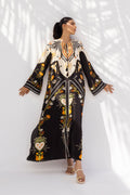 A flowing crepe kaftan, color blocked in rich ebony and ivory, offers the perfect canvas for intricate folkloric inspired motifs. The print blends geometric and floral patterns in shades of ivory, burnt orange, ochre, and olive, arranged symmetrically to create a flattering elongating effect. A tasseled slit at the neckline is framed by a geometric border and a delicately mirrored palm motif, striking a balance between artistry and effortless sophistication.