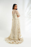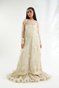 Exuding sophistication, a masterfully tailored sheer ivory tunic paired with a matching khaddi silk dress that flares out into crushed, sweeping ruffles. The organza top is embellished with intricate tonal aari embroidery and sequin on the borders and dispersed along the flattering silhouette, enhancing the elegance of the festive outfit.