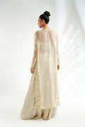 Look ethereal in a scalloped ivory organza front open jacket, embroidered with statement resham and aari details in a pearly hue with accents of crimson floral bouquets and glistening sequins. Taking cue from the embroidered borders of the organza shirt, the slim fit sleeves have scalloped edges. Paired with a matching tube top and palazzo pants cut from the softest charmeuse.
