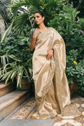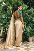 Radiating timeless sophistication, the meticulously embroidered self jamawar emerald green choli with zardoze and resham illuminates the regality of this jewel toned sari. The luxurious texture of a molten gold tissue is enhanced by delicate monotone zardoze detailing along the length of the sari, making way for a fully worked pallu completing the look.
