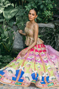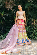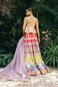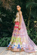 This standout ensemble is the perfect example of maximalist elegance. As your eyes travel down the sweeping multi-toned pure khaddi silk lehnga, you will appreciate the playfulness of a floral scenery complemented by a symmetrical border, all in vibrant hues of lilac, lime, azure, and hot pink. The flamboyant print, accented with gota and zardoze embroidery, makes its way to the cropped peplum cut from khaddi silk. The fluid drapery of a lilac organza dupatta, with gold and silver foil printing, adds a contemporary touch.