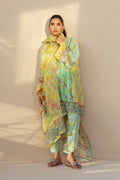 In a luminous medley of citron frost and seafoam, this ethereal cotton net shirt is adorned with intricate gota and zardoze work on a painterly floral print, exuding a whimsical charm. Paired with matching khaddi silk shalwar featuring sprinkles of embellishment. A diaphanous organza dupatta basking in a soft citrus hued print and gota details, celebrates contemporary finesse.