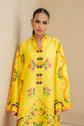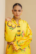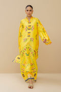 A vibrant canary yellow kaftan comes to life with whimsical floral and geometric motifs in painterly pastels and deep navy. Inspired by Mediterranean tilework and spring botanicals, the intricate print unfolds across a fluid silhouette that moves with effortless grace. Rich navy borders frame the hem, while 3D scalloped accents in a soft peach hue add a touch of texture along the billowing sleeves.