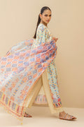 Delicate zardoze embroidery and gota detailing elevate this pastel-hued ombre shirt, crafted from khaddi silk. A seafoam base melts into soft shades of pink and coral, adorned with painterly floral motifs that create a gentle gradient of colour. A statement geometric border adds subtle depth, while a diaphanous organza dupatta with intricate gota accents ties the look together in serene pastels. Eggshell toned pure rawsilk trousers complete the ensemble with refined simplicity.