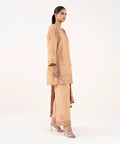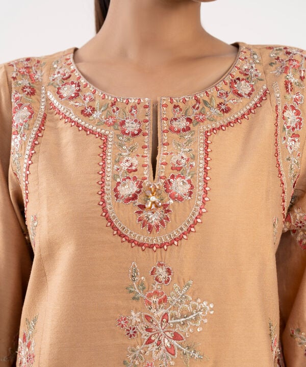 Make a statement in our embroidered peach silk cotton net straight shirt paired with matching viscose raw silk culottes and a blended chiffon dupatta.