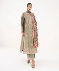 Make a statement in our embroidered olive green silk cotton net A-line shirt paired with matching viscose raw silk culottes and a blended chiffon dupatta.