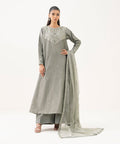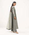 Make a statement in our embroidered grey blended silk cotton net flared A-line shirt paired with matching viscose raw silk flared trousers and a blended organza dupatta.