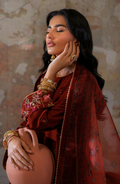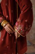 Embrace refined elegance with this rich rust ensemble, a perfect fusion of tradition and modern sophistication. The shirt is adorned with delicate thread embroidery, showcasing small, scattered floral motifs throughout the front for a subtle yet elegant look. The sleeves are embellished with intricate zari and thread embroidery, forming elaborate floral and geometric patterns that add depth and vibrance. Paired with shalwar, the outfit is completed with a sheer printed organza dupatta featuring embroidered floral sprays and a finely detailed border, harmonizing perfectly with the design.