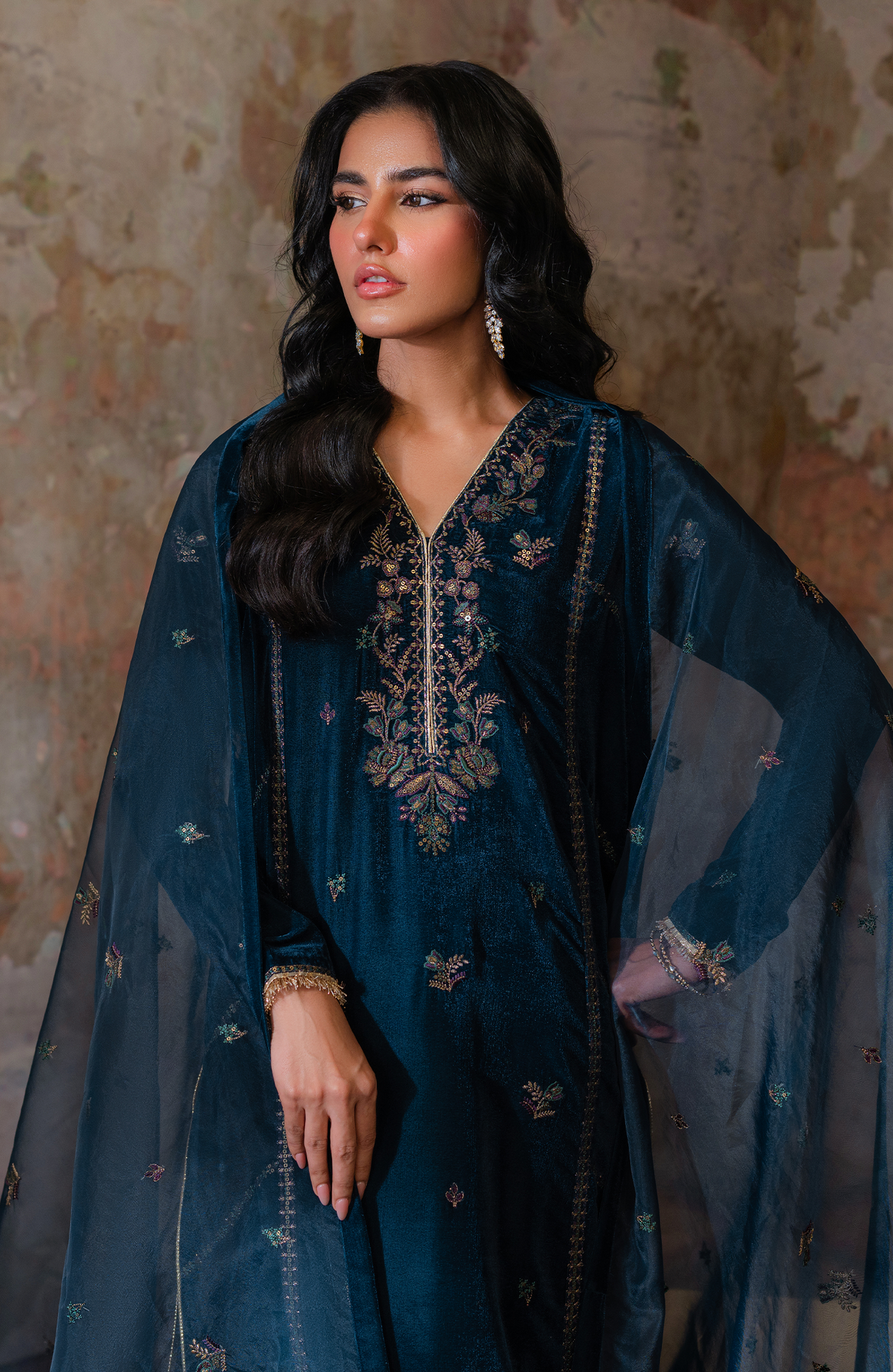 Step into timeless elegance with this deep teal ensemble, where intricate zari embroidery in golden and silver threads weaves a stunning tapestry of floral and traditional motifs. The neckline is adorned with detailed embroidery that accentuates its richness, while scattered embroidered accents add a delicate charm. The hemline and sleeves are highlighted with intricate patterns of tilla work. The net dupatta is embellished with fine thread embroidery, featuring dainty motifs and a scalloped border.