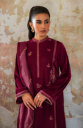 Step into elegance with this luxurious velvet shirt featuring a ban neck design, adorned with a stunning floral spray embroidery on the front. The left and right panels are beautifully detailed with floral motifs, while the sleeves are finished with delicate embroidered hems. The trousers feature light embroidery along the hem, and the organza dupatta is elegantly embroidered, completing this sophisticated ensemble with grace and charm.