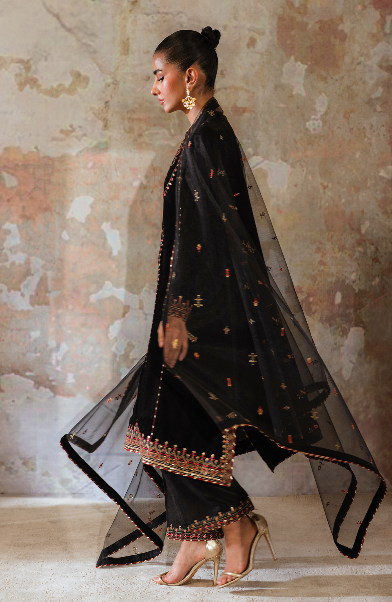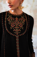 Indulge in luxury with this black velvet masterpiece, featuring a cross-stitched embroidered neckline and a central panel adorned with intricate motifs. The ornate embroidery along the hem and sleeves adds an elegant touch, while the sheer net dupatta is delicately detailed. The trousers complete the look with a refined embroidered border, creating a timeless, sophisticated ensemble.