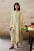 Butter yellow long jacquard shirt with a crew-to-V neckline adorned with tassels and all-over printed cutwork embroidery. Rounded hem and normal fitted sleeves give a refined finish.
