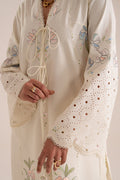 Off-white jacquard front-open shirt with a V-neckline featuring heart and flower-shaped tassels. Pastel embroidery mimics a hand-drawn feel, complemented by scalloped hems and chiffli/boring work on the sleeves and shirt panels.