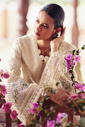 Ivory cotton shirt that features a front-open design, a V neckline, and bell sleeves. It has a full embroidered design created using the boring technique and comes with a slip.