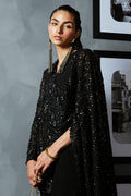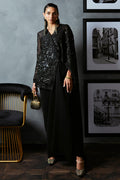 BLACK, FULL DRAPE DRESS WITH ASYMMETRICAL FULLY EMBELLISHED JACKET,