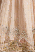 A pale pink ensemble compromising of a fully hand worked blouse and double layered lehenga with an attached mukesh dupatta