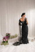 A midnight black net saree with sequins, cut dana and beads work on it paired with black sequins embellished blouse. Â