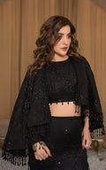 Unleash your inner beauty and elegance with our exquisite black embroidered cape. Accompanied by a matching embroidered blouse and tail skirt carefully crafted with intricate details of sequins, crystals, and lavish tassels. this luxurious ensemble is perfect for evening soiree.