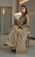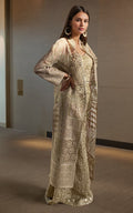Indulge in the opulence of our organza embroidered jacket, meticulously crafted with stunning zari work and cu work details. Complete the look with a glamorous banarsi blouse and elegant wide leg trousers, showcasing your impeccable taste and sophisticated style.