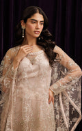 Make a statement in this glamorous ensemble, crafted with the exquisite craftsmanship. The net embroidered cape drapes beautifully over the tube top and skirt embellished with intricately detailed boti work, cut glass beads, crystals, and shimmering sequins. Unfold luxury at its finest with this timeless and sophisticated outfit.