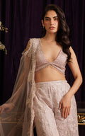 Indulge in opulence with our net embroidered jacket, embellished with delicate cutwork, exudes modern elegance, while the embroidered blouse sparkles with crystals and cut glass beads for a touch of glamour. Complete the look with the organza embroidered trousers for a truly luxurious and chic ensemble.