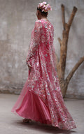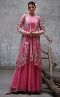 Embodying luxury with a flowing jacket adorned with resham, tilla, sequins, crystals, and 3D flowers, each detail reflecting meticulous artisanship. Paired with an inner net maxi featuring a stunning pearl belt, this ensemble exudes timeless glamour and sophistication.