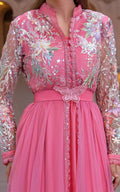 Make a stunning entrance in the net embroidered maxi dress featuring resham, tila, and sequins. The delicate detailing adds a touch of sophistication, while the included belt with a 3D butterfly motif complements the overall luxurious look.