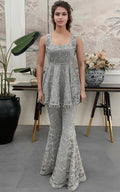 The allure of contemporary fashion with rich net embroidered peplum, paired with gharara pants, creates a chic silhouette that is simply irresistible. Adorned with crystals, tassels, and a pearl belt which is a perfect blend of tradition and modernity.