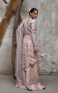 A luxurious amalgamation of sculpted silhouettes, decadent details, and sensual textures with our organza embroidered blouse, showcasing mesmerizing cutwork details and celestial mirrors embellished with sequins and tassels. Pair it with our stunning brocade lehnga, offering a graceful flair. The net dupatta features lavish embroidered borders with cutwork details, tiki stones, pearls, and mirrors, creating a lavish ensemble fit for royalty