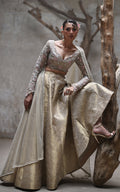 A luxurious amalgamation of sculpted silhouettes, decadent details, and sensual textures with our organza embroidered blouse, showcasing mesmerizing cutwork details and celestial mirrors embellished with sequins and tassels. Pair it with our stunning brocade lehnga, offering a graceful flair. The net dupatta features delicate borders with tiki stones and pearls creating a lavish ensemble fit for royalty.