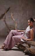 Make a statement in organza jacket, crafted with modern luxury. The intricate cutwork embroidery, adorned with pearls and sequins, adds a touch of elegance to this chic piece. Complete with shimmering sequins lining and paired with crushed chiffon trousers, this outfit is the epitome of comfort and style