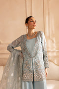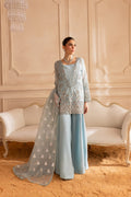 Ice blue embroidered wrap shirt with delicate hand embellishments, paired with plazo pants , foil print dupatta and a separate raw silk blouse