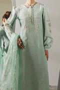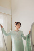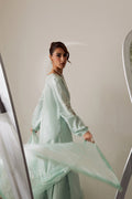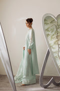 Ice blue premium silk embroidered shirt with pearl detailing, paired with an organza screen-printed dupatta and premium silk trousers featuring a screen-printed border.