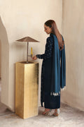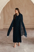 midnight blue velvet long shirt with intricate embellishments, paired with raw silk cigarette pants and a chiffon dupatta adorned with pearl hangings.