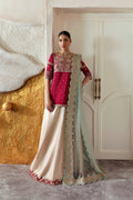 Magenta embroidered short shirt adorned with tassels, paired with light gold tissue lehnga featuring matching tassel accents. Styled with a contrasting aqua net dupatta with scalloped embellished borders.