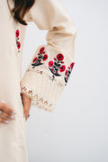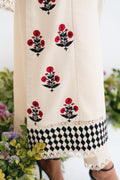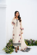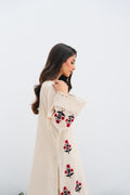 A meticulously crafted off-white shirt with our signature floral motif embroidery in the hints of red and black on the panels and chevron embroidered daaman detailing is the ideal option for your summertime festivities. It comes with a pair of handblock-painted chiffon dupatta to compliment the shirt.