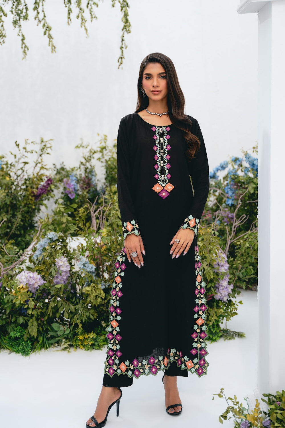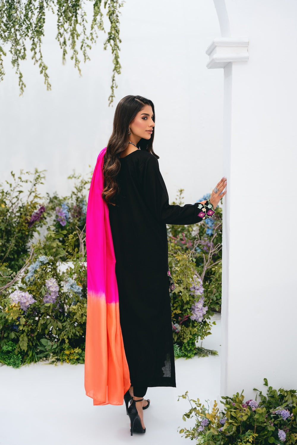 A jet black symmetrical long shirt, cut from summer lawn karandi, is rendered with hand embellishments and a cutworked daaman & sleeves. The shirt is paired with two-toned flowy silk dupatta and tapered pants.