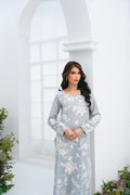 A modernised twist on the classic aari silhouette. This floral embroidered ensemble in monotone, finished with lace detailing is a statement piece for your summer affairs. It comes with a block-printed laced-up dupatta to complete the look. Style the look in a variety of ways.