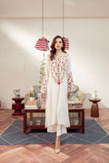 This festive outfit features hand embroidered lotus flowers all over the shirt front with pastel embroidery on the neckline. The fabric has a perfect fall that make this outfit stand out!