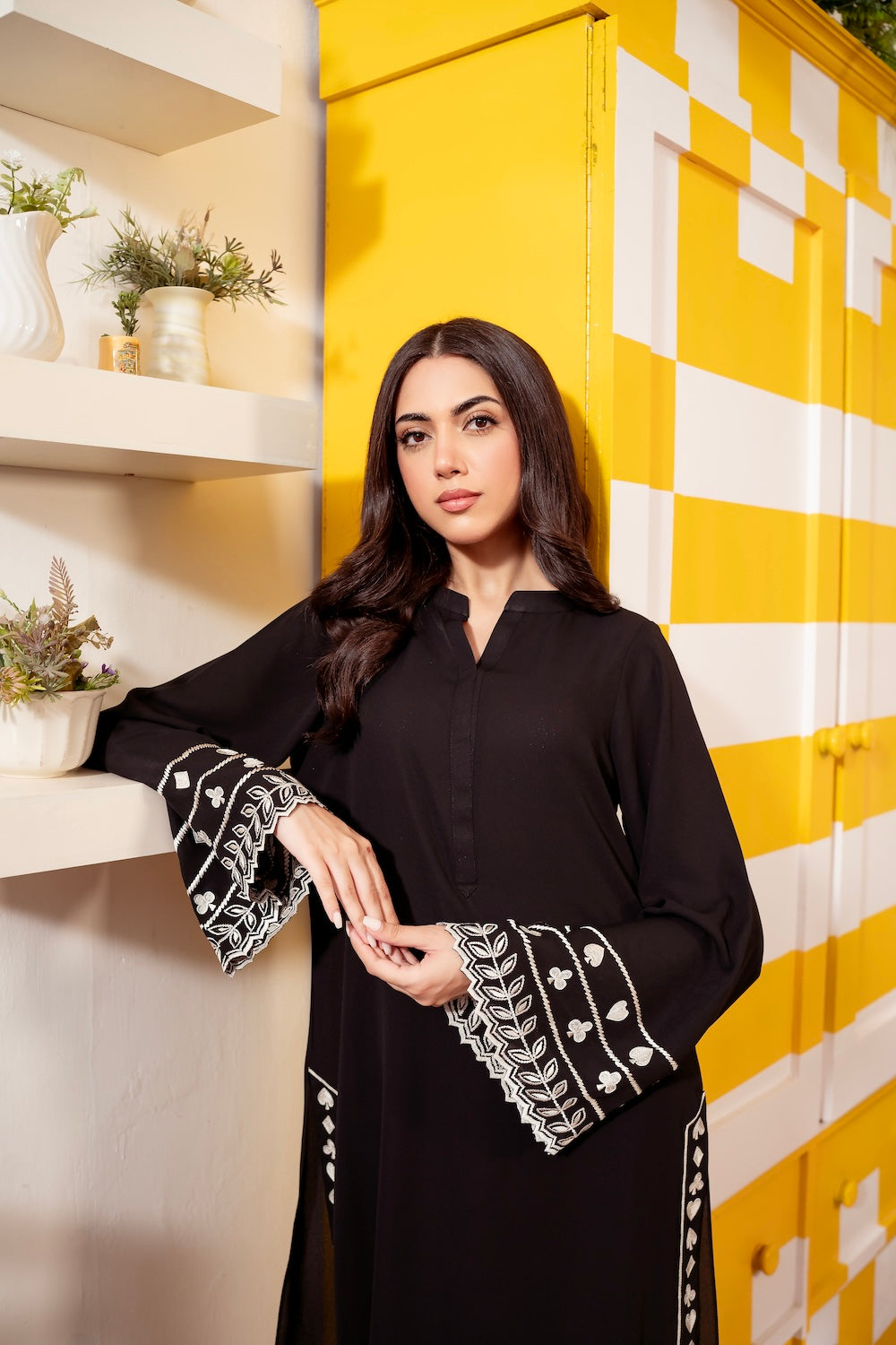 Modernize your wardrobe with this black ensemble which is adorned with beautiful embroidery in shades of black and white. Embellished with a myriads of motifs, the loose silhouette is versatile and modern, and is paired with embroidered culottes to complete the look.