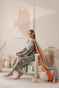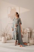 Ideal for formal soirees, this silver grey number exudes understated charisma while promising comfort. The meticulous aari embroidery on the rawsilk ensemble is accented with hand embellishment along the neckline and the scalloped sleeves. The beautiful two-tone dupatta adds fluidity and theatrics to the relaxed silhouette.