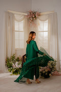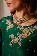 Perfect for special occasions and weddings, our statement emerald green shirt is crafted from pure silk with carefully placed hand ari all over the front with zardozi embellishments. The beautiful ensemble is adorned with delicately embellished motifs.