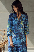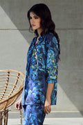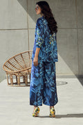 Formal digital printed co-ord set, inspired by Italian flora print featuring lemon motifs in deep blue and yellow hues, intricately hand embroidered with swarovski crystals, chain-stone, chains, and embellished buttons. Paired with complimenting digital printed culotte to complete the look.