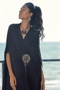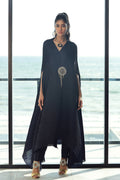 Formal navy blue pleated silk luxury drape, hand embroidered with heavy swarovski crystals and stone work. Paired with matching pants.