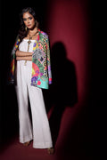 Formal White Jumpsuit With Custom Digital Printed Jungle Print Jacket Featuring Floral, Zebra And Tiger Motifs. Hand Embroidered With Heavy Sequin And Bead Work On Printed Motifs.