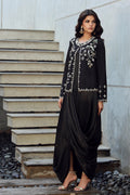 Black formal drape, paired with stunning hand embroidered jacket with zardoze work, stones, swarovski crystals, and chain-stone hand embellishment.
