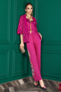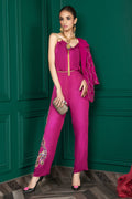 This formal jumpsuit and jacket look is created using different techniques featuring our signature dragon motif on the jumpsuit and geometric embroidery on the jacket. The jacket features intricate metallic stud and thread work. The formal jumpsuit has pleating and hand crafted dragon motif with intricate zardozi, bead and crystal work.
