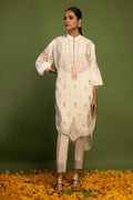 This beautiful pure silk shirt is meticulously embroidered with resham work, applique and extensive cutwork in pastel hues. Featuring our signature boxy silhouette with miraab hemline. Paired with straight fit trouser with lace and organza detail.