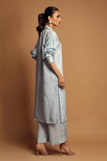 Wedgewood Blue Formal Front Open Style Shirt With Kora /Dabka Zardoze Hand Embroidery. Adorned With Stoned and Chain Details And Organza Detail On The Collar With Hand Embelished Buttons.